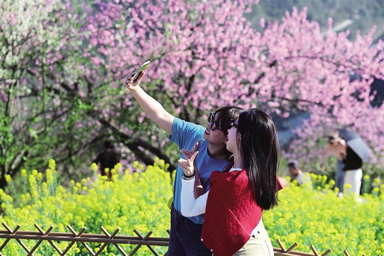 3月25日,游客在安徽省黄山市歙县霞坑镇石潭村春游赏花。