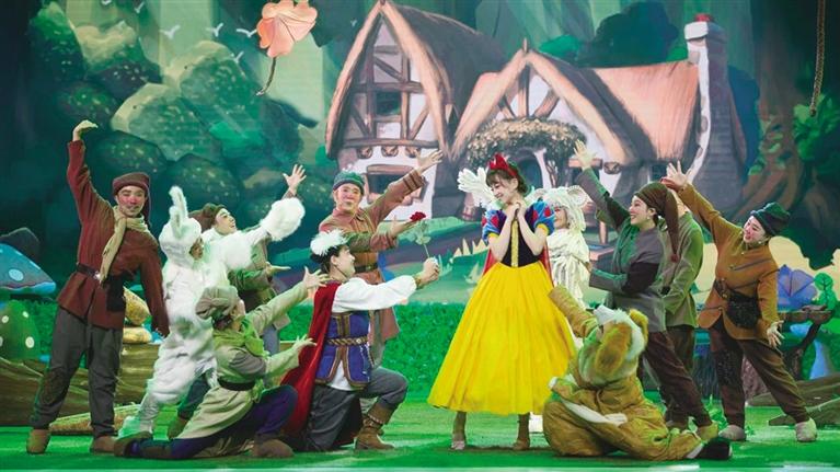 此次演出别出心裁,巧妙融合音乐、舞蹈,搭配沉浸式的舞台设计,用灵动的旋律、活泼的肢体动作和充满奇幻色彩的舞美特效,将森林奇遇、重生等《白雪公主》中经典桥段呈现在舞台上。此外,剧中还特别设计了与角色互动的环节,让小观众能够走进剧情,感受“真善美”的力量。
