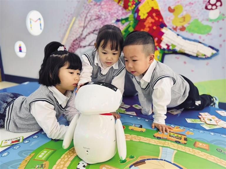 “孩子们正在体验的是学前人工智能编程游戏,游戏设计者将程序指令封装到卡片、地垫等实物中,使原本抽象的编程变成像‘拼拼图’‘搭积木’一样‘看得见摸得着’的游戏,让幼儿根据自己的想法模拟出各种各样的未来城市生活情景,包含爱国、文明、环保、科学等多方面内容。在解决问题的过程中,培养他们的科学素养及发散思维、动手操作、合作协调等能力。”该园教师陈婷婷介绍。