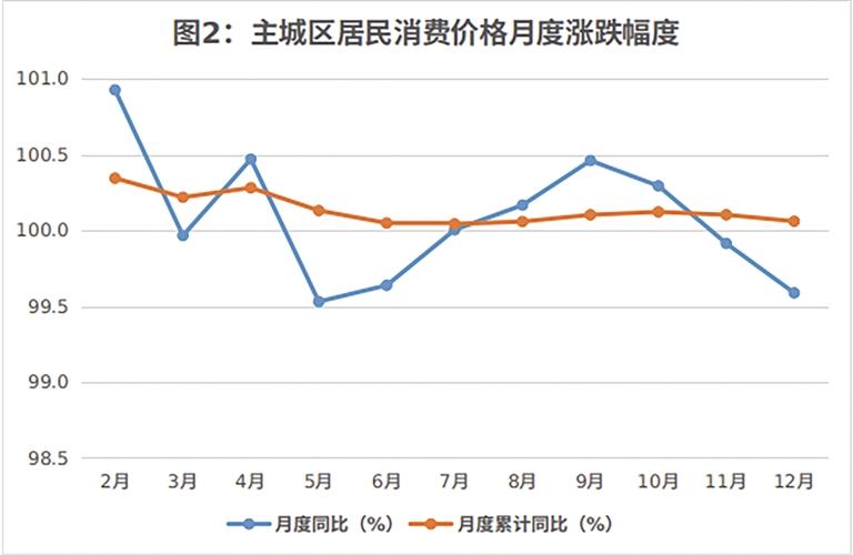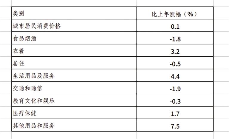 全年全市主城区居民消费价格比上年上涨0.1%。分类别看,交通通信类下降1.9%,食品烟酒类下降1.8%,教育文化娱乐类下降0.3%,生活用品及服务类上涨4.4%,其他用品及服务类上涨7.5%,衣着类上涨3.2%,医疗保健类上涨1.7%,居住类下降0.5%。
