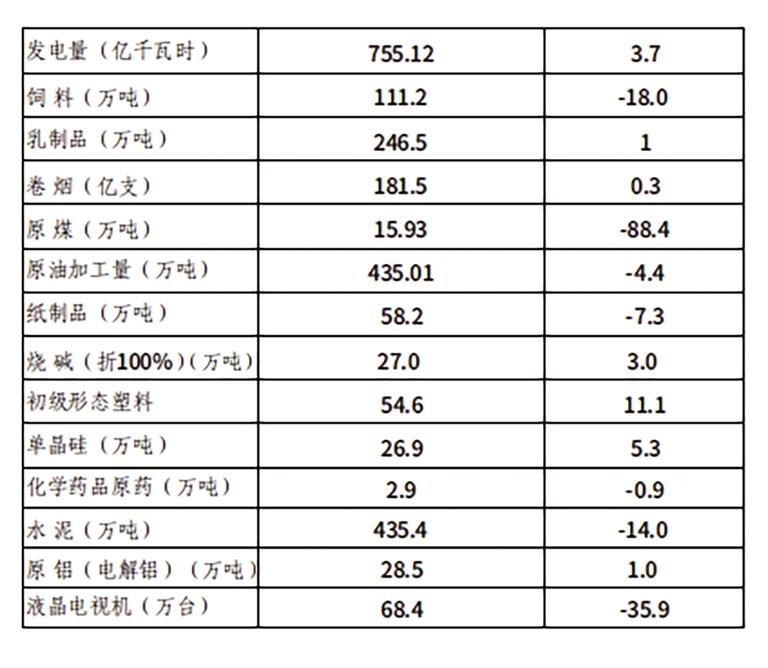 从主要工业产品产量看,发电量755.12亿千瓦时,比上年增长3.7%;饲料111.20万吨,下降18.0%;乳制品246.54万吨,增长1.0%;卷烟181.50亿支,增长0.3%;原油加工量435.01万吨,下降4.4%;烧碱(折纯)26.96万吨,增长3.0%;水泥435.44万吨,下降14.0%;单晶硅26.89万吨,增长5.3%;原铝(电解铝)28.50万吨,增长1.0%。