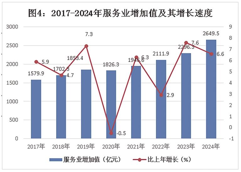 全年批发和零售业增加值380.52亿元,比上年增长8.9%;交通运输、仓储和邮政业增加值261.59亿元,增长5.5%;住宿和餐饮业增加值79.91亿元,增长5.3%;金融业增加值271.46亿元,下降1.1%;房地产业增加值276.13亿元,增长3.9%;其他服务业增加值1372.00亿元,增长8.4%,其中,信息传输、软件和信息技术服务业增加值140.28亿元,增长11.4%;租赁和商务服务业增加值174.23亿元,增长0.8%。全年规模以上服务业企业营业收入1357.68亿元,增长21.1%。