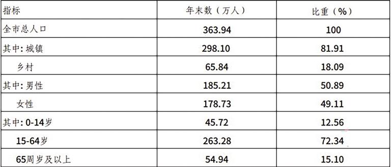 年末全市常住人口363.94万人,比上年末增加3.53万人。其中,城镇人口298.10万人,乡村人口65.84万人;常住人口城镇化率达81.9%,比上年提高1.2个百分点。男性人口185.21万人,女性人口178.73万人。全年出生人口2.40万人,出生率为6.62‰;死亡人口2.25万人,死亡率为6.22‰;人口自然增长率为0.4‰。