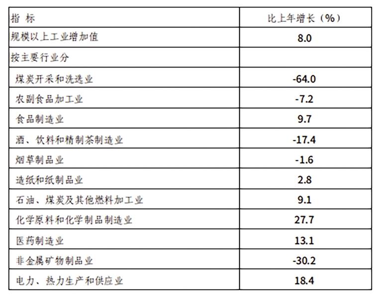 全年全部工业增加值比上年增长5.0%。其中,规模以上工业增加值增长8.0%。在规模以上工业中,分门类看,采矿业增加值下降34.2%,制造业增长4.5%,电力、热力、燃气及水生产和供应业增长20.5%。分经济类型看,国有控股企业增加值增长11.0%,股份制企业增长7.9%,外商及港澳台商投资企业增长8.4%,私营企业增长11.1%。分行业看,食品制造业增加值增长9.7%,烟草制品业下降1.6%,造纸和纸制品业增长2.8%,石油、煤炭及其他燃料加工业增长9.1%,化学原料和化学制品制造业增长27.7%,医药制造业增长13.1%,非金属矿物制品业下降30.2%,电力、热力生产和供应业增长18.4%。