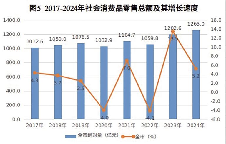 全年社会消费品零售总额1265.00亿元,比上年增长5.2%。按经营地统计,城镇消费品零售额1125.76亿元,增长5.2%;乡村消费品零售额139.25亿元,增长5.5%。按消费类型统计,商品零售额1094.41亿元,增长4.8%;餐饮收入170.59亿元,增长7.5%。