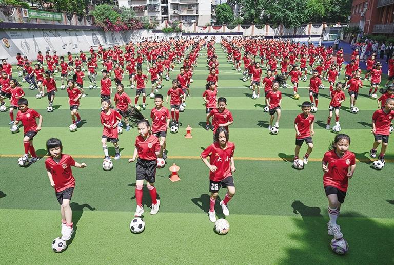 5月19日,重庆市大田湾小学,同学们参加足球大课间活动。近年来,重庆各中小学校积极践行“健康第一”的教育理念,为同学们量身定制了多套“花式”大课间活动方案,让孩子们走出教室,动起来、跑起来、活跃起来。 ■新华社记者 陈诚 摄