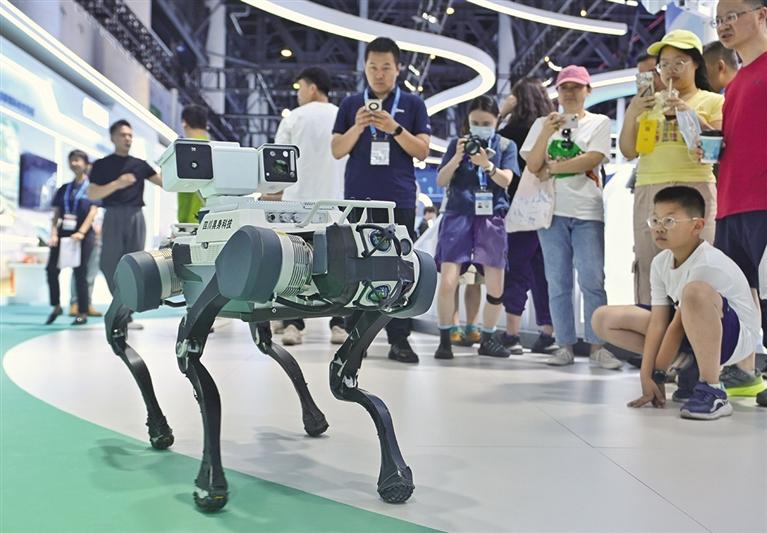 5月25日,观众在第二十届中国西部国际博览会成都馆参观展出的机器狗。