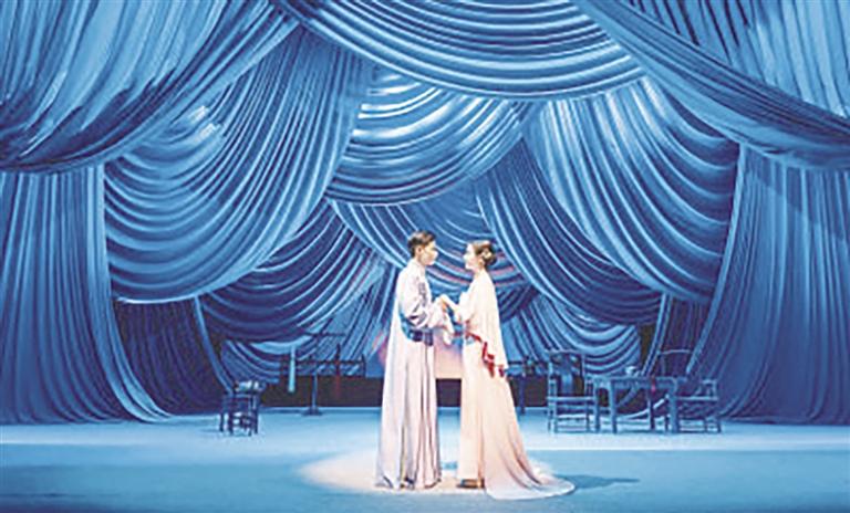 全剧最美的,当数首尾极富象征意味的两场戏。开场,风雪交加,老年莲生卧倒雪地,青年莲生在远景轻纱后独舞,由海棠幻化的年轻的玉春在一侧思念,对比强烈;结尾,莲生与玉春两人手持海棠,翩翩起舞,宛若“化蝶”,凄美至极。“强化海棠,无非是将人物命运与意象表达扭合在一起。”闫锐觉得,托物寄情,本是与《游园惊梦》《牡丹亭》等传统戏曲一脉相承的“氛围感”,因为“舞台就是‘造梦’的空间”。
