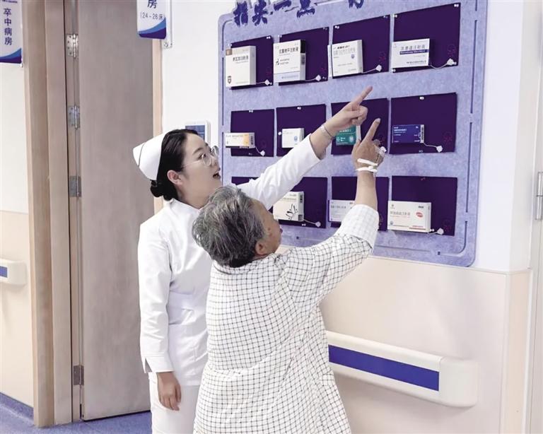 护理团队人员用无纺布制成宣传栏,将十余种脑血管疾病患者常用药的药盒固定在宣传栏上。药盒侧面加装了防水、防摔的微型按钮及扬声器。患者按图索骥,手指轻按,就能听到清晰的药物指导信息,既方便又实用。