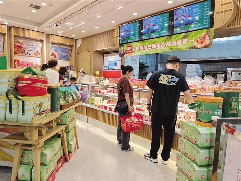 5月25日,记者来到位于赛罕区的一家连锁超市,看到展示架上摆满了价格不等的礼盒装粽子,品种仍然以传统的红枣粽、豆沙粽为主,也有叉烧粽、板栗肉粽、玫瑰红茶粽等新颖品种,充分满足了消费者的多元需求,购买的市民络绎不绝,市场活力涌动。