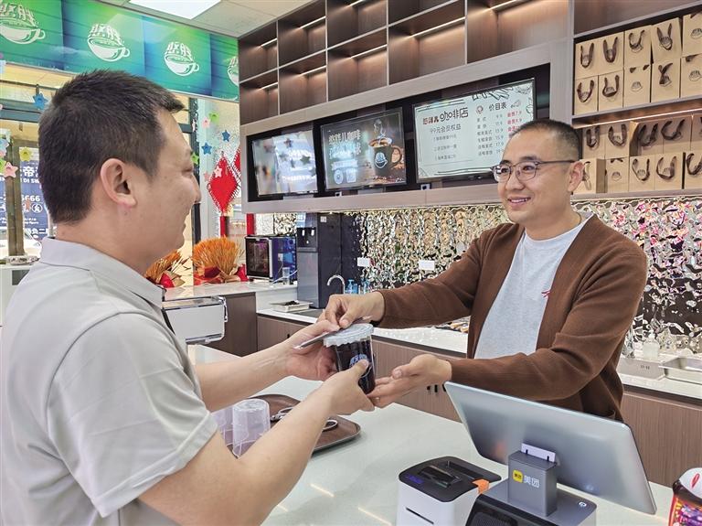 店前,“憨胖儿咖啡”创始人云龙正热情推销,过往的市民也被这家店所吸引。