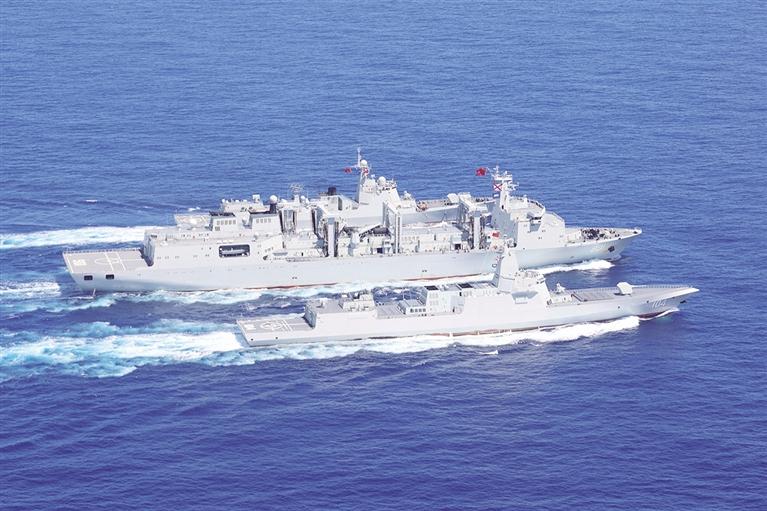 6月上旬,海军航母编队在西太平洋海域开展训练。图为编队属舰进行航行补给。