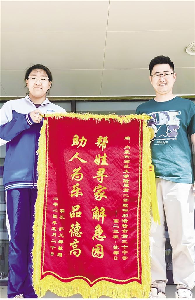 “感谢这名高中生,她的爱心挽救了一个家庭,不敢想象,如果没有她孩子在深夜遇到危险该怎么办。”2024年6月,走散男孩家长将一封感谢信和一面锦旗送到了呼和浩特市第三十中学高二学生苏都日的手中。