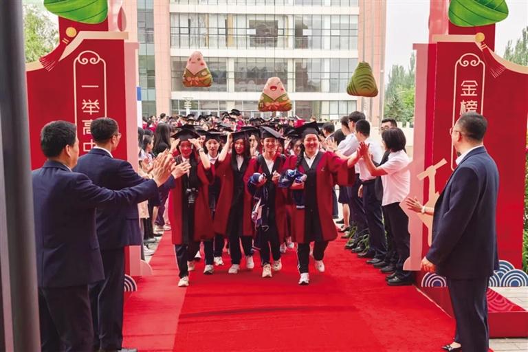 北京四中呼和浩特分校的毕业典礼则充满传统寓意,学子们跨过“状元门”,头顶象征“高中”的高粽,在老师们“旗开得胜”的祝福声中留下合影。“这种仪式让我感受到了传统文化的祝福,很暖心。”高三学生王清看着胸前的粽子挂件说。