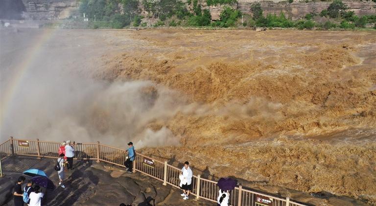 7月4日,游客在山西吉县黄河壶口瀑布景区欣赏壮美瀑布群景观(无人机照片)。