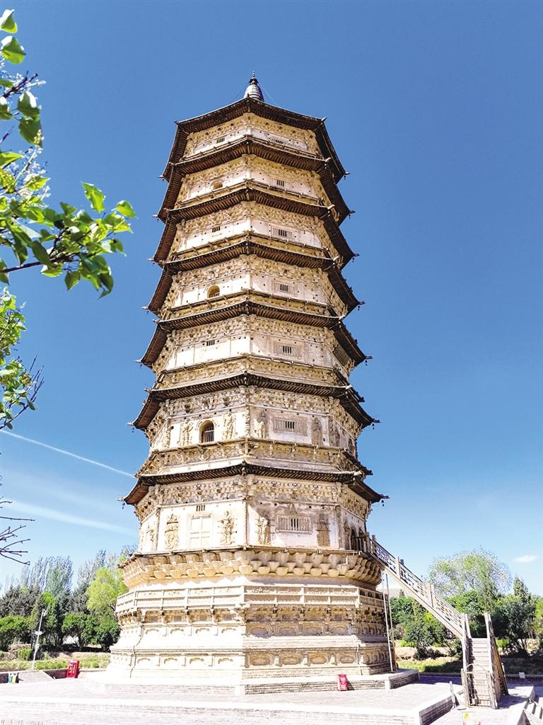 一个丽日清空的午间,我伫立于呼和浩特市郊那座久负盛名的华严经塔下,仰视高耸的穹顶直抵蓝天,聆听那清脆风铃声掠过耳际,似乎从一层层塔檐那褶皱里发现了时光印记,飘逸思绪漫步在遥远的丰州滩上,仿佛走进这座辽代丰州古城,尽览白塔的风貌与雄姿。