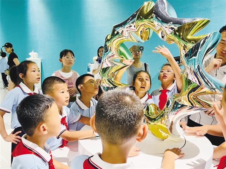 “老师,这个骑马的人为什么举着弓箭?他是要去打猎吗?”一位学生指着一件展现游牧民族英姿的雕塑,迫不及待地向讲解员提问。讲解员解释道:“你观察得很仔细,这展现的是游牧民族的传统生活方式和勇敢精神,弓箭不仅是狩猎工具,也是力量和自由的象征。”面对一件件风格各异的雕塑作品,讲解员细致的解答为学生们打开了一扇扇理解艺术与文化的窗口,让他们与静默的雕塑产生了生动的对话。