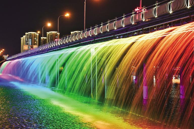 已是晚上9点多了,如意河岸依旧热闹,年轻父母推着婴儿车散步,文创小摊前,游客正挑选印着彩虹瀑布的冰箱贴。当最后一道水幕缓缓落下,有人对着“彩虹”的余影许愿,有人把美丽的夜景分享进家庭群,晚风带着水汽拂过脸颊,连空气里都飘着幸福的味道……