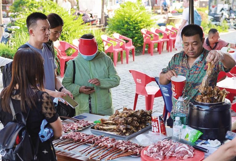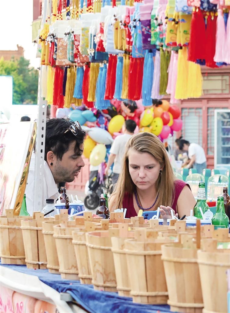 美食与手工艺品市集是街区的另一大亮点。烤羊腿、酸奶酪等特色美食香气四溢;手工皮具、银饰等文创产品摊位前客流不断。