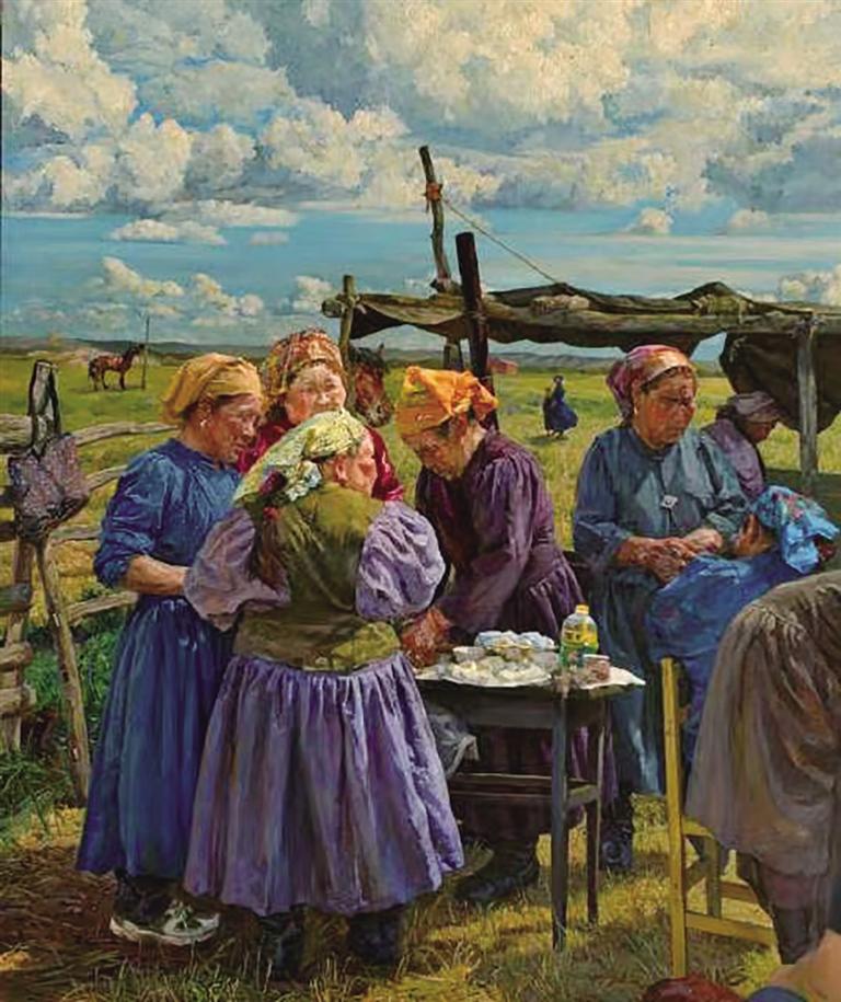 总而言之,通过对北疆文化中草原生活的观察与关注,体会这片草原的文化特质,用最具代表性的形象或符号,来表现人们的生存状态。现代牧民对草原生活最深刻的印记,在他们的生活中,表露出对草原生活的眷恋与对现代生活方式选择性的接纳。这些典型形象的面部与身形,需要以原生态意识与历时性追忆方式去呈现,强化真实感,强调在共时性的画幅中塑造时代群像。通过人物形象的深入刻画,努力探寻当下人们的精神状态与心理皈依,回避北方草原题材油画作品的猎奇式表述,尽可能内化为一种民族深层性的原生态特质。