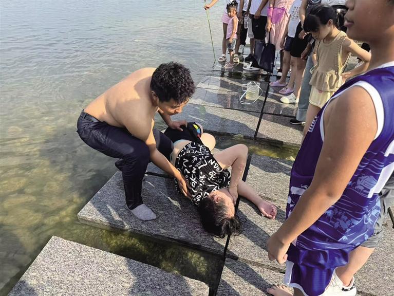 在岸上,李鹏程与七八位素不相识的市民紧密配合,有的找来救生圈抛向水中,有的帮忙把人拉上岸。短短5分钟内,众人齐心协力将母子二人救上岸。