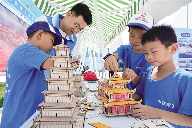 8月12日,在山东青岛,2025年建设工地“小候鸟”驿站暑托班的孩子们在拼装建筑模型。