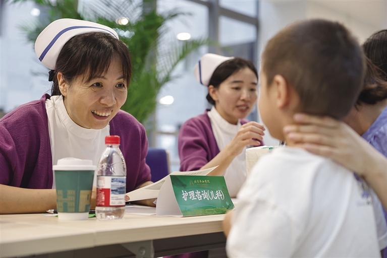 8月19日,一位护理人员在北京协和医院东单院区参加义诊活动。