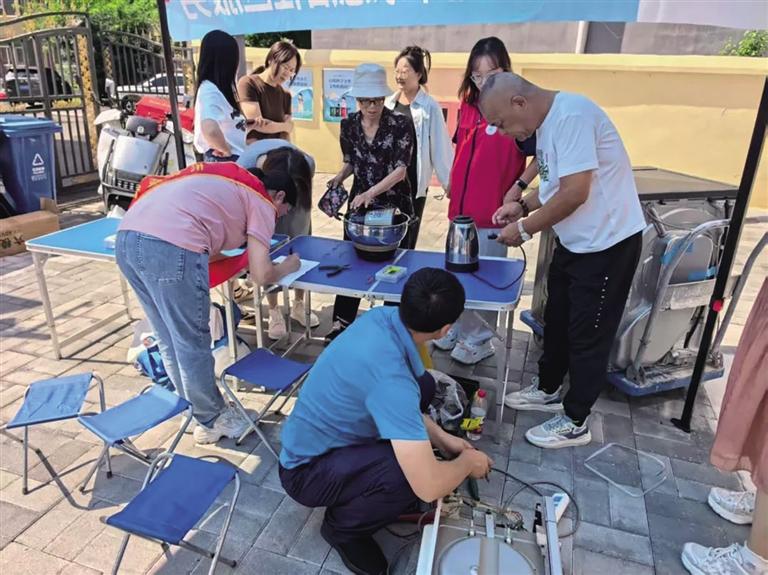 活动中,居民们或是带着待修的电饭煲、烧水壶、电风扇、微波炉等小家电,或是带着需要清洁护理的外套、毛衣等衣物有序排队。东鸽电器的工作人员搭起临时服务点,各项服务衔接顺畅、井然有序。维修师傅们拆螺丝、查线路、换零件,娴熟地开展工作,同时向居民讲解家电的日常使用保养技巧;负责衣物护理的工作人员则细心处理着各类污渍,一边操作一边告知居民不同面料的清洗注意事项;还有工作人员专门解答居民关于房屋装修设计、家具尺寸测量等方面的疑问,提供专业建议,受到居民的一致好评。