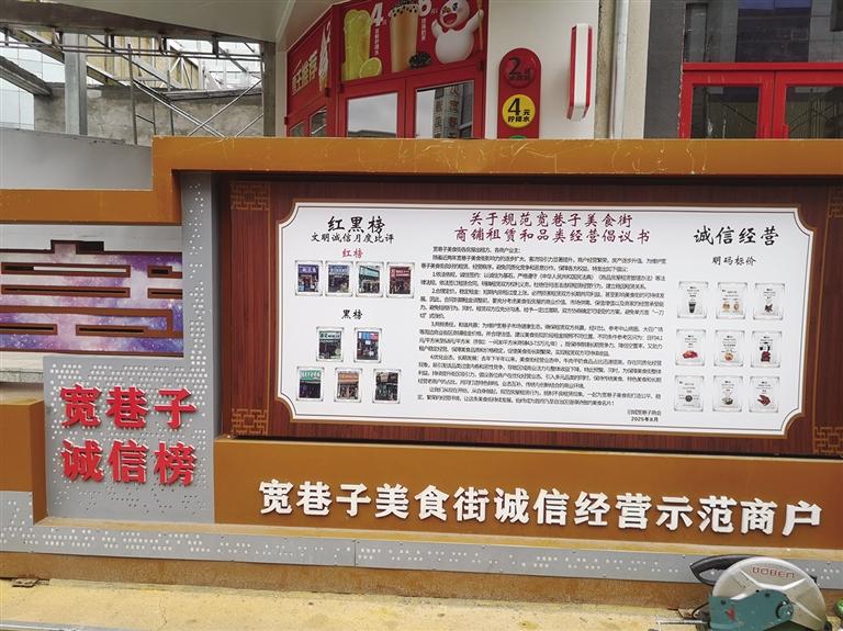 记者了解到,在通道街街道统筹下,由通道街市场监管所、商业街城管中队依据日常巡查记录、消费者投诉举报、卫生抽检结果、明码标价检查等数据进行月度综合评定,2024年在宽巷子美食街设立美食街诚信经营商户红黑榜,红榜旨在表彰在食品安全、明码标价、服务质量等方面表现优异,长期坚持诚信经营的商户,树立行业标杆;黑榜则对存在不良经营行为的商户进行曝光,起到警示和督促整改的作用。宽巷子美食街通过公开透明的监督方式,规范商户经营行为,为消费者提供直观的消费参考,帮助他们快速识别优质商户,规避消费风险,提升消费体验和满意度。