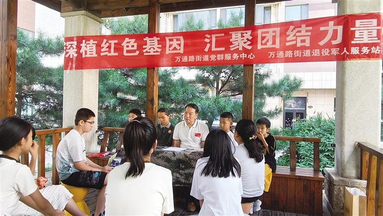 日前,新城区万通路街道办事处联合万通社区及追光自习室,组织辖区青少年在社区室外凉亭开展了“深植红色基因 汇聚团结力量”主题宣讲活动。青城老兵宣讲团副团长赵宝平结合自身经历,以生动鲜活的讲述,为孩子们上了一堂深刻的爱国主义教育课,引导青少年传承红色基因,厚植爱国情怀。