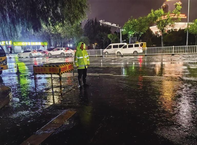 同一时间,师大社区党总支书记殷香守在昭乌达路与学苑西街交会路口。她穿着雨衣、手持警示牌站在车流中提醒行人:“慢儿点走,前面积水深!”见行人过马路犹豫不决,她立刻上前搀扶:“来,我陪您,踩我指的地方走。”雨夜凉风袭来,她嘴唇冻得发颤,声音却温和有力:“大家平安,我站一夜也值。”