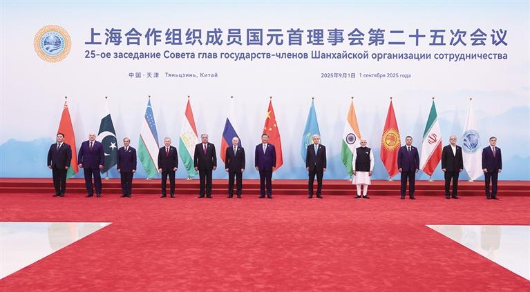 9月1日上午,上海合作组织成员国元首理事会第二十五次会议在天津梅江会展中心举行。中国国家主席习近平主持会议并发表题为《牢记初心使命 开创美好未来》的重要讲话。这是习近平同出席会议的上海合作组织成员国领导人、常设机构负责人集体合影。 ■新华社记者 黄敬文 摄