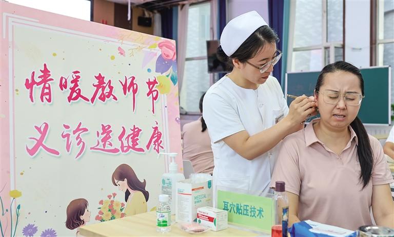 针对教师职业常见的颈椎、腰椎、咽喉不适及疲劳等问题,志愿者精心准备了脉诊、拔罐、艾灸等中蒙医特色诊疗服务。义诊现场温馨忙碌,志愿者耐心解答健康疑问,传授养生知识,用专业的技术和温暖的服务,为辛勤的园丁们送上了一份特殊的、充满健康关怀的节日礼物。