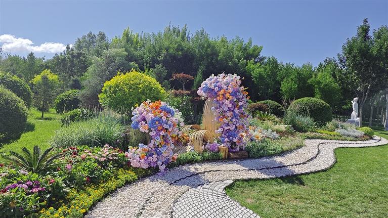 在景观营造上,采用“形意结合”的手法:一方面,精选花期长、适应性强的植物,通过组团式种植构建“海中小岛”意象——高低错落的景石和高大亚乔木模拟海岛丘陵,疏密有致的花卉犹如岛上绽放的自然植被,再搭配竹编骨架与蓝紫色仿生花打造成浪花造型花艺小品,错落分布在花境中,微风拂过,仿生花的花瓣轻轻颤动,宛如海浪拍打礁石的生动场景;另一方面,借助柔和的色彩与层次搭配,传递出和平、静谧与浪漫的氛围,让市民、游客在观赏中感受英雄守护下的安宁,以此表达对海防英雄的崇高敬意。