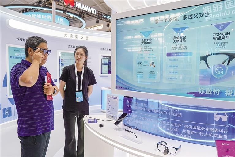 9月15日,观众在云南昆明举行的2025年国家网络安全宣传周配套活动——网络安全博览会暨网络安全产品和服务国际推介会上体验智能眼镜。 ■新华社记者 彭奕凯 摄