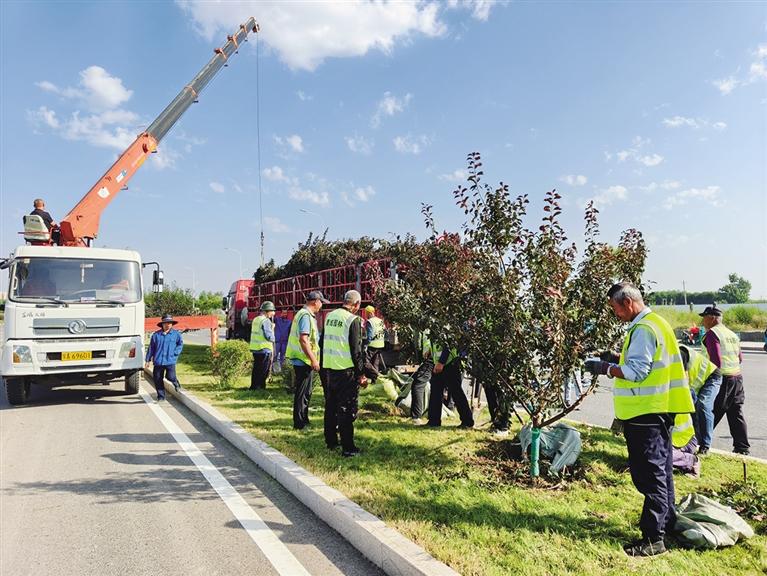补植现场一派繁忙有序的景象。在新城区沁阳街东段,刚通车不久的道路两侧,新植的行道树已整齐排列。3辆绿化浇水车依次排开,工作人员操控着水枪,细密的水流均匀浇洒在树坑中,确保了每株苗木都能喝足“定植水”。北二环与哲里木路交会处的街角绿地,6名园林工人正默契协作,每道工序都细致规范。