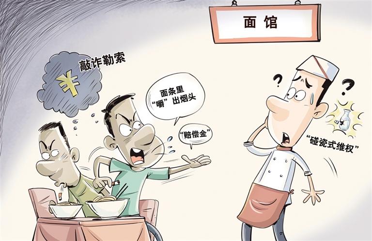 面条里“嚼”出烟头,一逛超市就“买”到过期零食……看似是消费纠纷,实则行敲诈勒索之事。近期,多地政法机关、市场监管部门披露了一批“碰瓷式维权”典型案例,让一批职业“碰瓷人”现形,为维护良好营商环境和商户合法权益,亮出法律之剑。