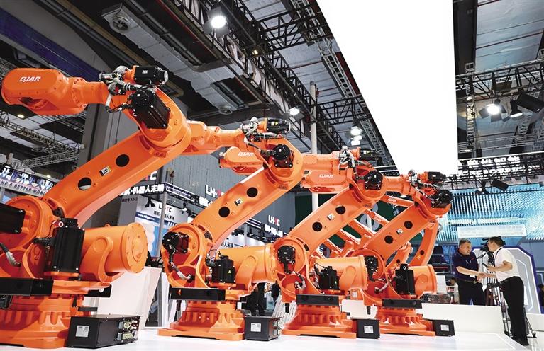 这是展览现场展示的一组大型工业机器人产品(9月23日摄)。