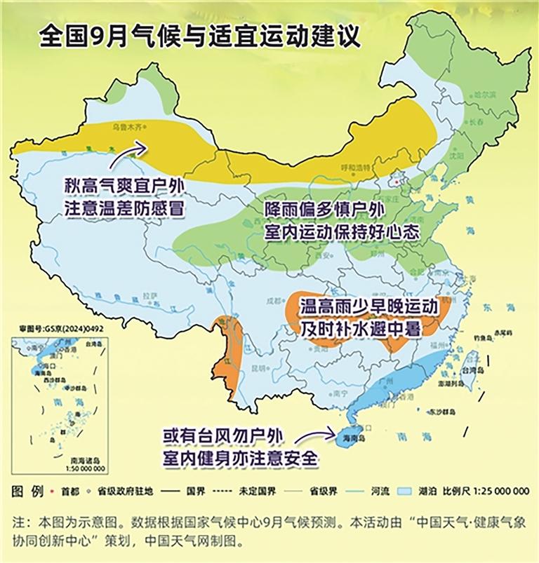 这个时节冷空气开始逐步向南渗透,暖湿气流与干冷气团交汇带逐步移动到华北至西北区域,容易形成秋雨。因此预计这个9月内蒙古西南部局部、西北地区东部、华北等地降水将会偏多,存在强降雨及连阴雨天气。运动锻炼前要及时关注天气变化,阴雨天气建议选择居家锻炼或室内运动。