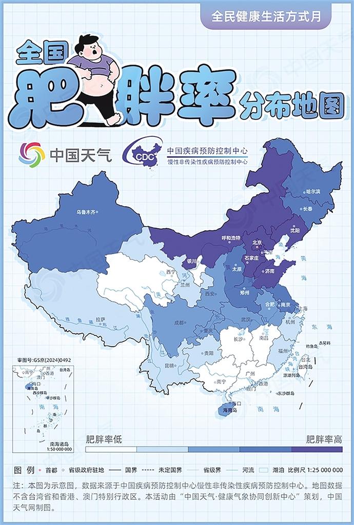你关注过自己的体型吗?你的体重健康吗?9月是“全民健康生活方式月”,中国天气联合中国疾病预防控制中心慢性非传染性疾病预防控制中心,共同推出了全国肥胖率分布地图。地图显示,北京、天津、河北、山东等地是肥胖率最高的省份,低肥胖区域分别是湖南、江西、广东、广西、青海、宁夏。全国肥胖率分布地图揭开了肥胖问题的复杂性——它并非简单的“吃得多、动得少”,而是遗传、气候、饮食、地形、社会环境等多重因素交织的结果。