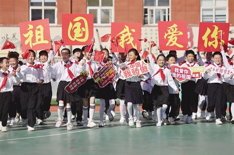 9月25日,在山东省临沂市沂南县,第三实验小学的小学生们参加“祝福祖国”活动。