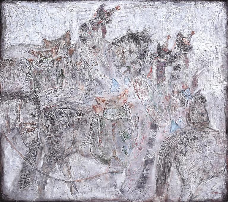 综合材料绘画艺术语言、形式的表达,出发点是从自然中挖掘绘画和非绘画材料本身的物质美感并结合艺术家的精神诉求创造富于物性美感的画面作为艺术语言探究的本体,也是现当代艺术观念进一步拓展的结果,具有不可替代的审美独特性和精神内涵。每种材料都具有其独特的颜色、形状、质地和相应的触感、形式,能够承载相应的精神内涵。不同材料的综合运用,不仅体现了材料本身的形式美,而且表现出一种独特的精神追求,这恰恰契合了游牧民族崇尚自然的精神特质。创作的《长调》《牧歌行》等作品,就是我坚持借用苍茫雄浑又不失瑰丽隽秀的游牧民族视觉文化语言符号在综合材料绘画创作领域对少数民族绘画题材进行的自在表达和大胆尝试。