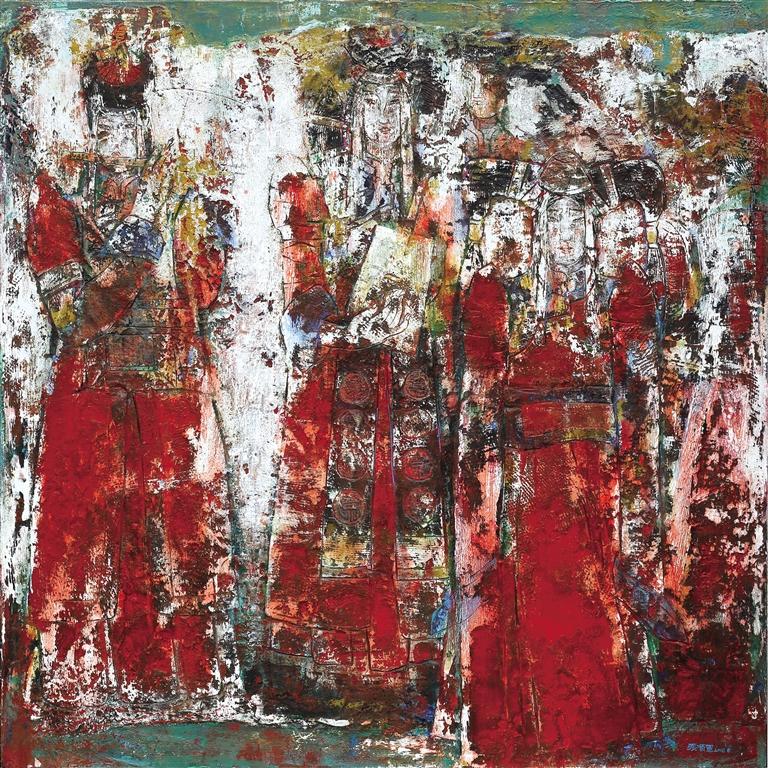 创作中我首先考虑的因素是画面的意境,运用欧洲传统丹培拉绘画材料,热衷于对斑驳肌理的特殊偏好,醉心于半透明、或半不透明乳液多层罩染。意在对绘画语言本体的深入探究和思考以及对绘画语言秩序的梳理和重建。在色调的选择、对比和布局上深入思考对主题的主观表现,比如蒙古族人们喜欢白色(查干)和蓝色(呼和),蒙古人认为白色代表圣洁、自然,蒙古包、毡、长袍、哈达等都采用白色,白色在生活中又来源于奶食(查干伊德),每年的正月又称白月(查干萨日)等等。在日常生活中,蒙古族还特别喜爱红色,认为红色象征生命温暖亲切,把它作为本民族的标志,帽缨等装饰品大都是红色的。《蒙古·赞》《长调》运用了红色调来表现,根据绘画主题对事物本身的固有色进行夸张的布局,并强调色彩的平面化处理,用自己多年秉承的方式和绘画语言表达对游牧生活的切身感受;我将其中的各种透视和分割进行统一处理,放弃传统透视观念对空间的建构,使色彩变得更加单纯,更好地承载精神意涵;在这里,物理属性的“固有色”也就成了承载精神的“观念”。