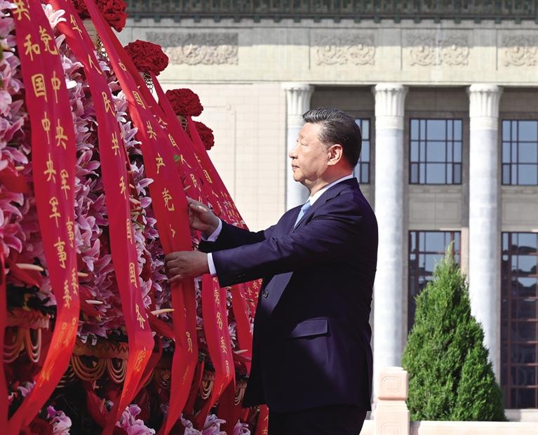 9月30日上午,党和国家领导人习近平、李强、赵乐际、王沪宁、蔡奇、丁薛祥、李希、韩正等来到北京天安门广场,出席烈士纪念日向人民英雄敬献花篮仪式。这是习近平整理花篮上的缎带。 ■新华社记者 李响 摄