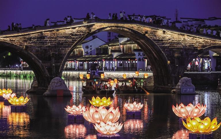 国庆中秋“双节”期间,浙江省杭州市临平区塘栖古镇推出“月满运河·梦栖塘栖”祈福之夜活动。游客们可以体验运河摇橹船夜游、赏运河花灯、广济桥赏月等特色活动,感受水乡古镇的运河雅韵。