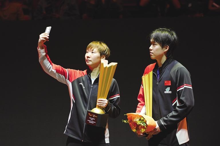 10月5日,男单冠军王楚钦(右)和女单冠军王曼昱在颁奖仪式上合影。