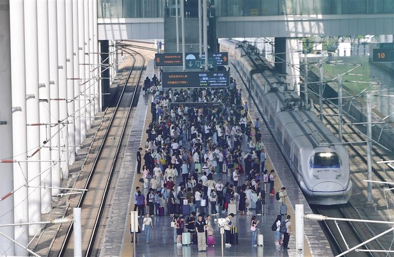 10月8日,旅客在江苏无锡火车站站台乘车。