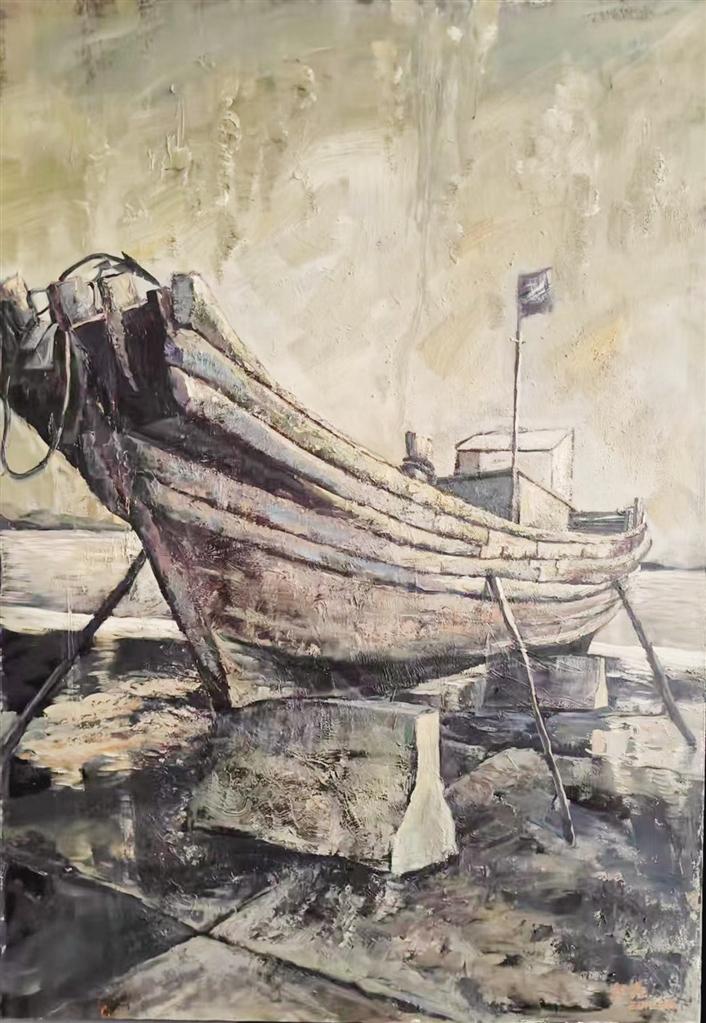 从他的油画作品《春雪的记忆》《泊船》中可见其对自然深刻的体悟与细腻的表达。更令人感动的是,他始终将艺术之根深扎于北方山河之中,迎着风雪、顶着骄阳,走进武川的寒冬、踏入黄河畔的河滩,在极端自然环境中捕捉那一刻雪停云开、夕照染山的苍茫诗意。正如他在《向山而行——一个北方画者的自白》中所写,那是“独属于北纬40度的浪漫”。
