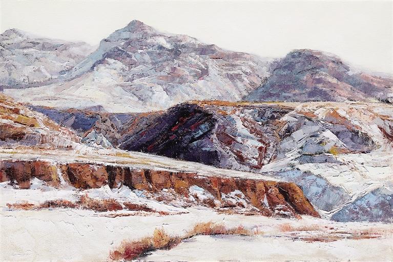 他的《雪霁》《和林雪景》等作品,以赭色崖壁与纯净白雪相对比,犹如“白糖加咖啡”——苦中带甜,恰似这片土地上的人们:战天斗地、吃苦耐劳,却始终心怀热望、笑对风霜。