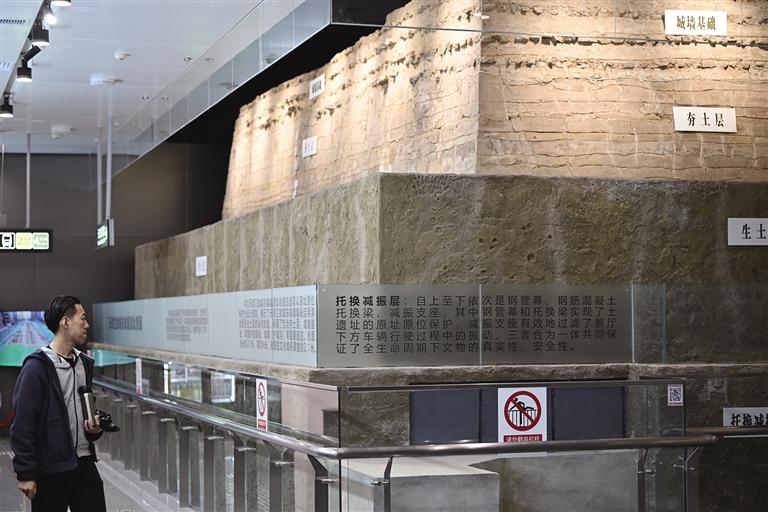 近日,位于天津地铁4号线东南角站的天津卫故城东城墙遗址文物展厅正式开放,展厅内21米长的城墙遗址层次分明,让乘客在出行时也能了解天津历史。